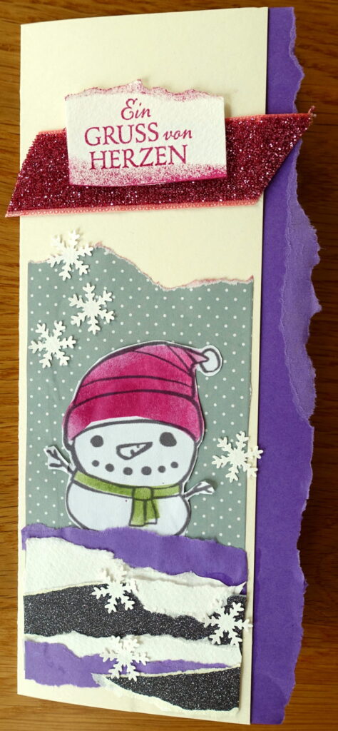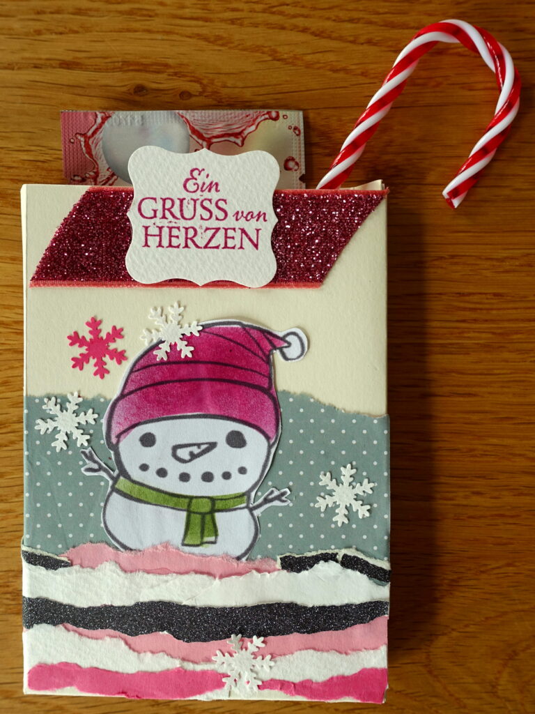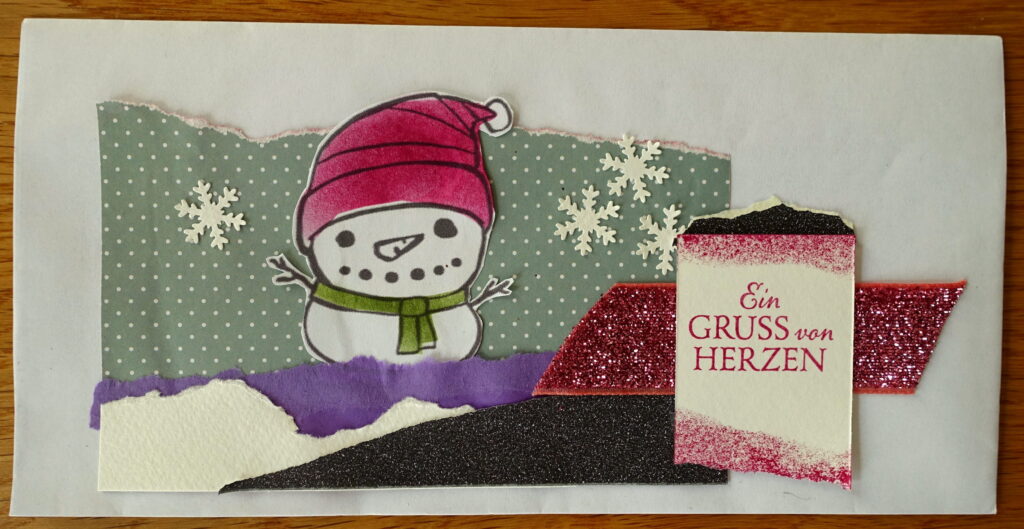 Für ein Geschenkset, bestehend aus Klappkarte, Briefumschlag und kleiner Verpackung eignet sich ein Entwurf, der in Varianten auf allen drei Werkstücken wiederholt wird. In diesem Beispiel ist es der Schneemann, der auf einer Landschaft aus gerissenen Papierstreifen steht. Die Wiederholung des Motivs, der Farben und des Spruchs schaffen eine Einheitlichkeit, die hochwertig und überzeugend wirkt. Außerdem hilft die Strategie dabei, sich nicht mit zu vielen Ideen oder Materialien zu verzetteln.