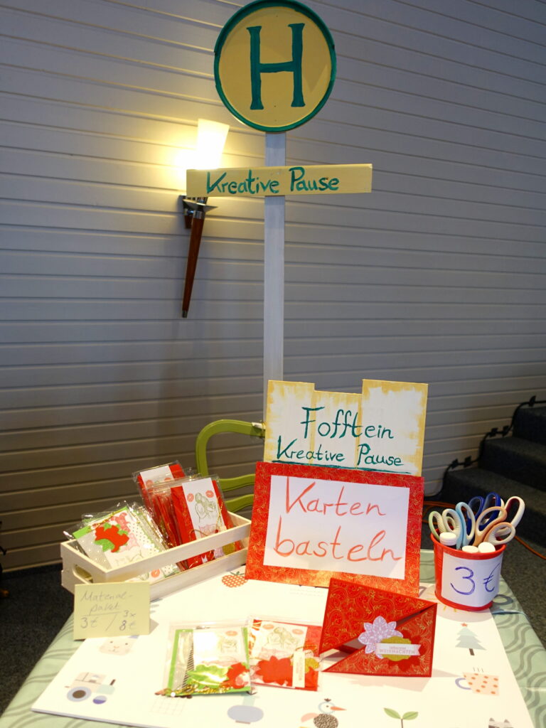 Beispielsweise einen Tisch mit einer „Kreativen Pause“, an der weihnachtliche Karten gebastelt werden können.