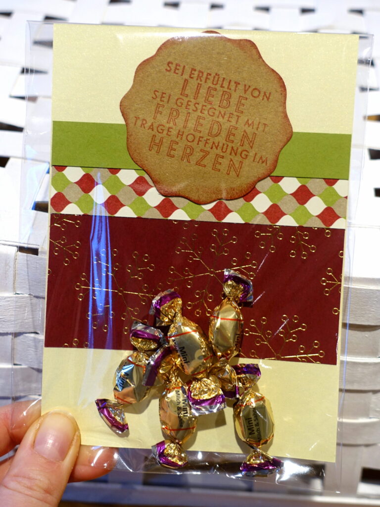 Die Postkarte wird in die Plastikfolie geschoben und zusätzlich Minibonbons eingefüllt: So befindet sich der Weihnachtsgruß zusammen mit den Süßigkeiten in der Verpackung und nichts kann abfallen oder verloren gehen!